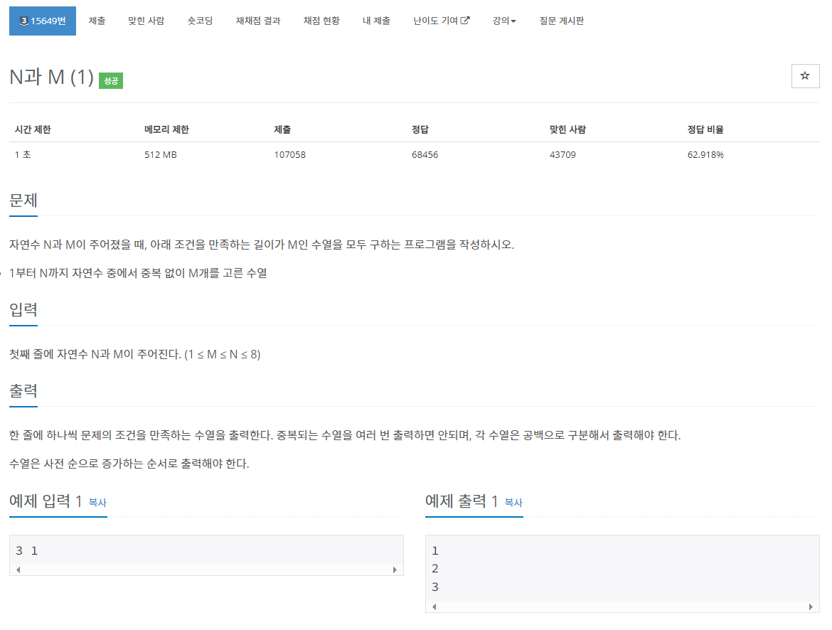 문제링크 https://www.acmicpc.net/problem/15649 15649번: N과 M (1) 한 줄에 하나씩 문제의 조건을 만족하는 수열을 출력한다. 중복되는 수열을 여러 번 출력하면 안되며, 각 수열은 공백으로 구분해서 출력