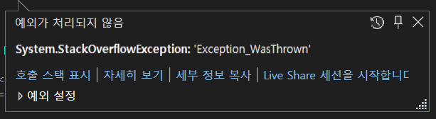 아래와 같은 재귀함수를 호출하면 무한히 호출하다가 스택 영역이 초과되면서 에러를 반환한다.