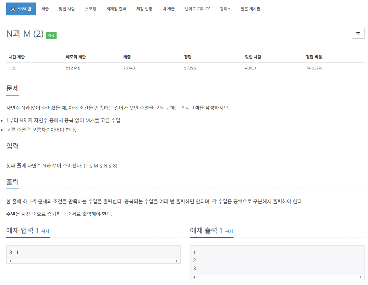첫째 줄에 자연수 N과 M이 주어진다. (1 ≤ M ≤ N ≤ 8)