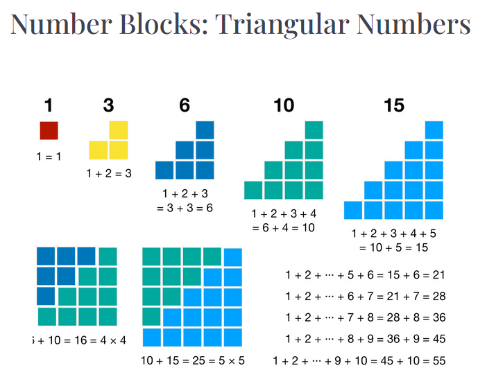 삼각수는 첫 n 개의 양의 정수의 합이므로 다음과 같은 식이 성립된다.