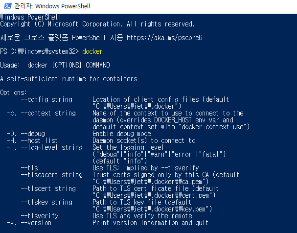 찾아보니 도커 데스크톱 자체에서 콘솔을 입력하는 부분이 없어서 파워 쉘(PowerShell)을 이용해서 도커를 컨트롤해보자.