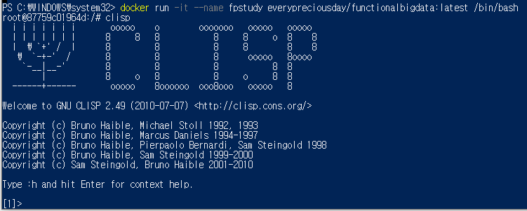설치한 도커 이미지에는 CLISP 및 REPL 환경이 설치되어 있다. REPL은 'Read Eval Print Loop'의 약자다. REPL을 사용하면 코드를 한 줄씩 입력하고 그 결과를 즉각적으로 확인할 수 있다. 즉, 마치 컴퓨터와 대화하듯이 한 문장씩 주고받을 수 있어서 프로그래밍 언어를 익힐 때 유용하다. CLISP의 REPL을 기동 하는 방법은 다음과 같다.