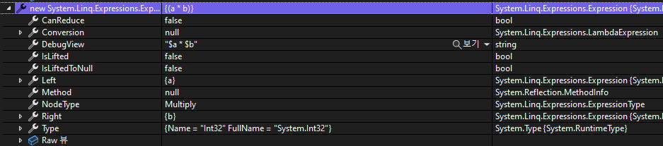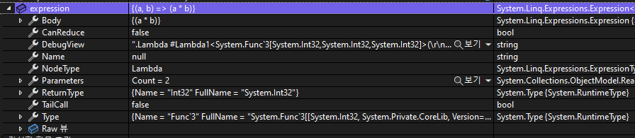 Body 속성은 {(a + b)}이고, NodeType은 Lambda, Type은 Func 대리자 형식 정보를 가지고 있다.