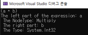 Console.WriteLine($"The left part of the expression: {left.Name}\n The NodeType: {body.NodeType}\n The right part: {right.Name}\n The Type: {body.Type}");