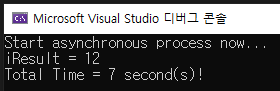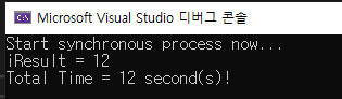 LongProcess1()과 LongProcess2()는 서로 독립적이며 각각 특정한 처리 시간이 걸린다. 예제에서는 이들 메서드를 동기식으로 실행하므로 두 메서드를 실행하는데 총 12초가 필요한데, LongProcess1()을 처리하는데 5초, LongProcess2()을 처리하는데 7초가 필요하다.