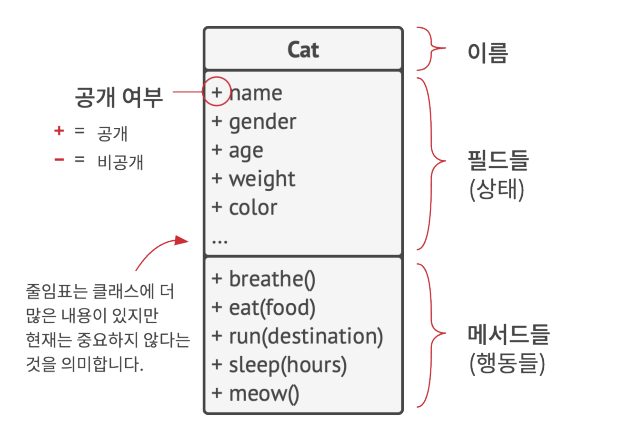 오스카라는 고양이가 있다고 가정해 보자. 오스카는 객체이며, Cat 클래스의 인스턴스이다. 각 고양이는 이름, 성별, 나이, 체중, 색깔, 좋아하는 음식 같은 일반적인 속성들을 많이 갖고 있다. 이러한 속성들을 클래스의 필드들이라고 한다.