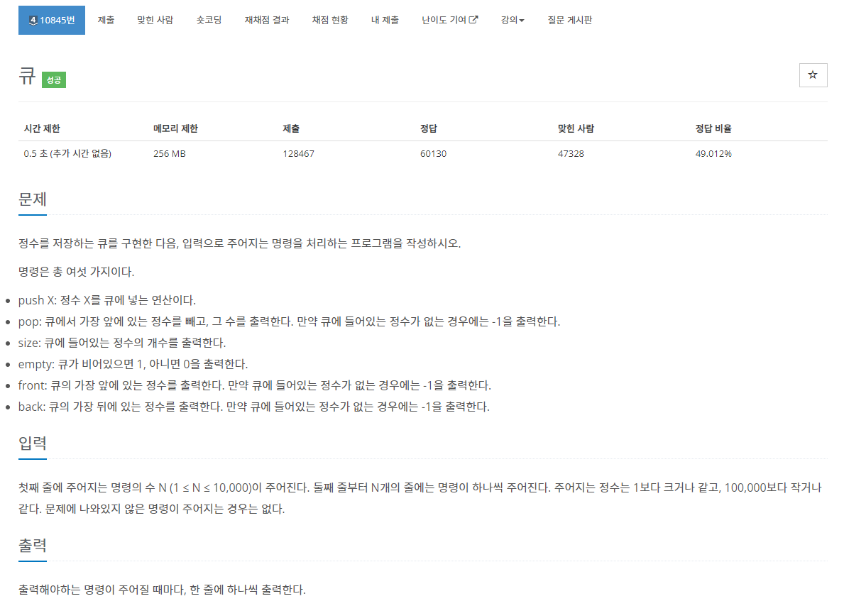 정수를 저장하는 큐를 구현한 다음, 입력으로 주어지는 명령을 처리하는 프로그램을 작성하시오.
