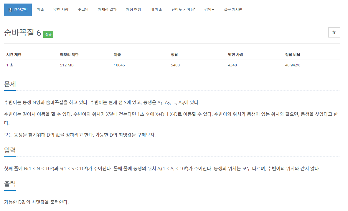 첫째 줄에 N(1 ≤ N ≤ 105)과 S(1 ≤ S ≤ 109)가 주어진다. 둘째 줄에 동생의 위치 Ai(1 ≤ Ai ≤ 109)가 주어진다. 동생의 위치는 모두 다르며, 수빈이의 위치와 같지 않다.