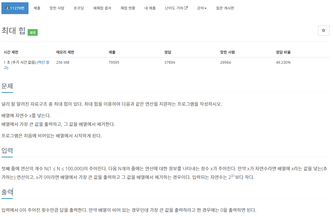 입력에서 0이 주어진 횟수만큼 답을 출력한다. 만약 배열이 비어 있는 경우인데 가장 큰 값을 출력하라고 한 경우에는 0을 출력하면 된다.