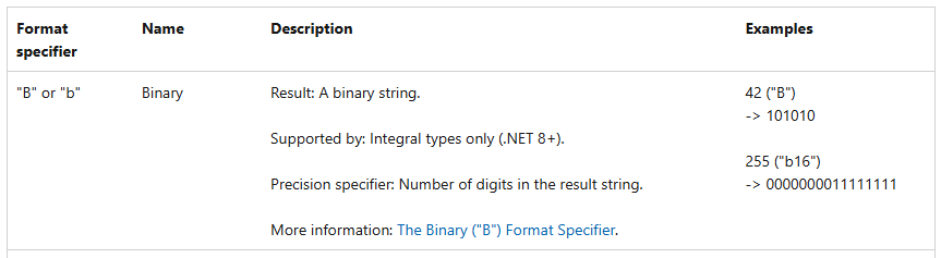 *이진수 변환은 .NET 8 이상에서만 지원한다. 이하 버전에서는 서식 에러가 발생한다.