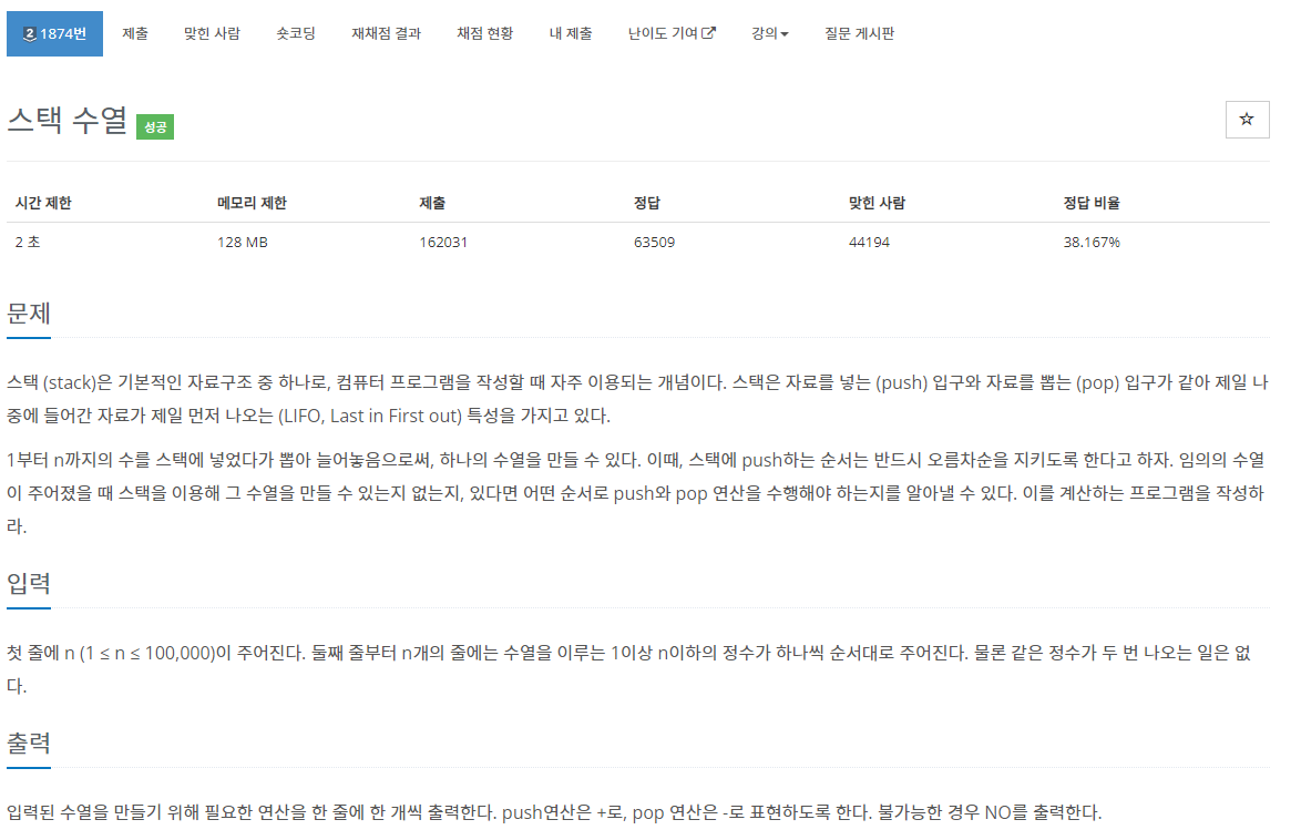 1부터 n까지의 수를 스택에 넣었다가 뽑아 늘어놓음으로써, 하나의 수열을 만들 수 있다. 이때, 스택에 push하는 순서는 반드시 오름차순을 지키도록 한다고 하자. 임의의 수열이 주어졌을 때 스택을 이용해 그 수열을 만들 수 있는지 없는지, 있다면 어떤 순서로 push와 pop 연산을 수행해야 하는지를 알아낼 수 있다. 이를 계산하는 프로그램을 작성하라.