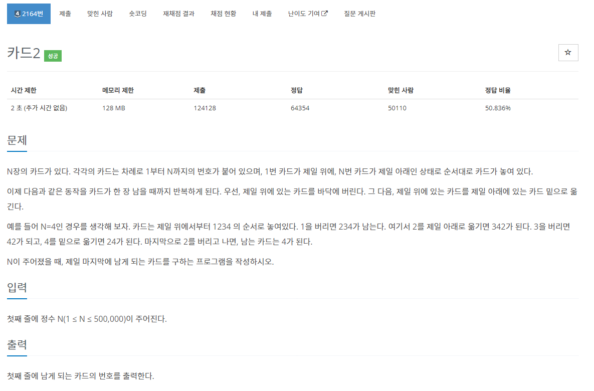 예를 들어 N=4인 경우를 생각해 보자. 카드는 제일 위에서부터 1234 의 순서로 놓여있다. 1을 버리면 234가 남는다. 여기서 2를 제일 아래로 옮기면 342가 된다. 3을 버리면 42가 되고, 4를 밑으로 옮기면 24가 된다. 마지막으로 2를 버리고 나면, 남는 카드는 4가 된다.