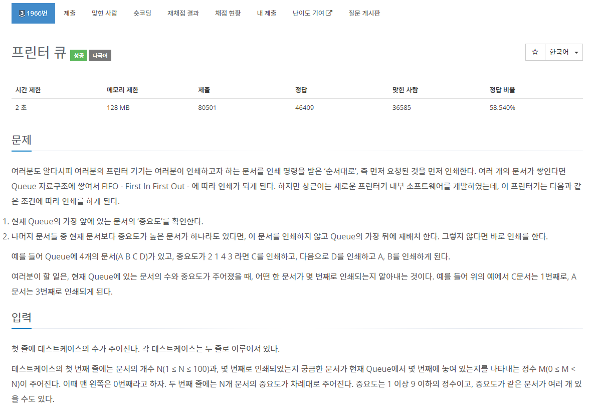 예를 들어 Queue에 4개의 문서(A B C D)가 있고, 중요도가 2 1 4 3 라면 C를 인쇄하고, 다음으로 D를 인쇄하고 A, B를 인쇄하게 된다.
