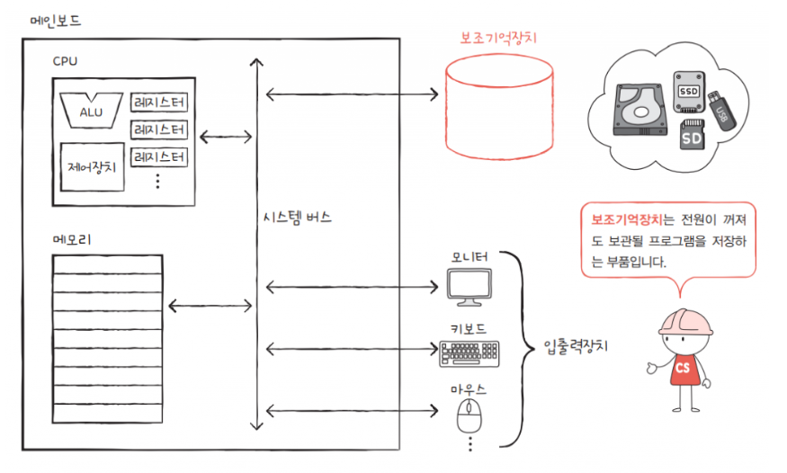 - 보조기억장치는 메인보드 내 시스템 버스와 연결되어 있다.