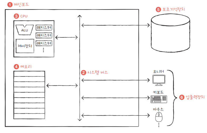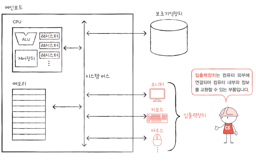 - 모니터, 키보드, 마우스 등은 메인보드 내 시스템 버스와 연결되어 있다.
