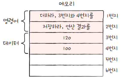 물론 이것은 메모리를 이해하기 쉽게 그림으로 나타낸 것일 뿐 실제로는 이와 같이 저장되지 않는다. 명령어와 데이터는 모두 0과 1로 표현되기 때문에 겉보기에는 마치 0과 1로 이루어진 데이터를 저장한 것처럼 보인다.