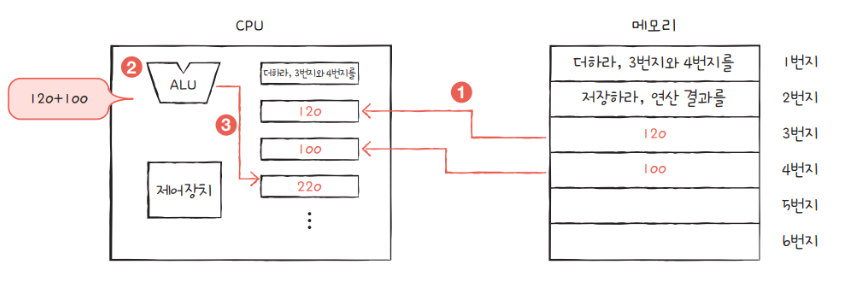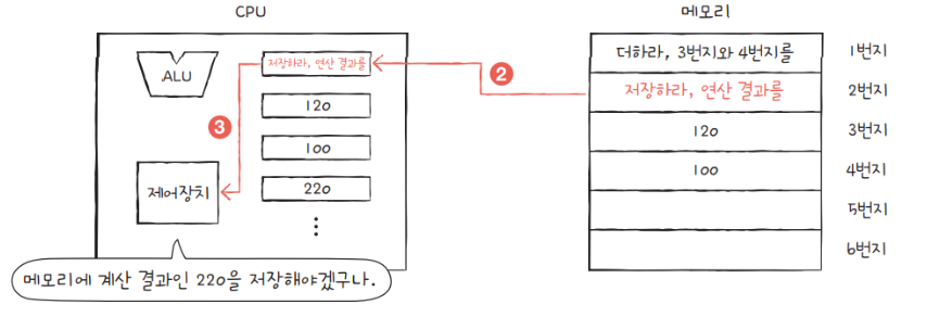 메모리는 2번지에 저장된 명령어를 CPU에 건네주고, 이 명령어는 레지스터에 저장된다. 제어장치는 이 명령어를 해석한 뒤 메모리에 계산 결과를 저장해야 한다고 판단한다.