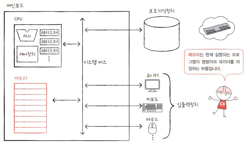 - 메모리는 현재 실행되는 프로그램의 명령어와 데이터를 저장한다.