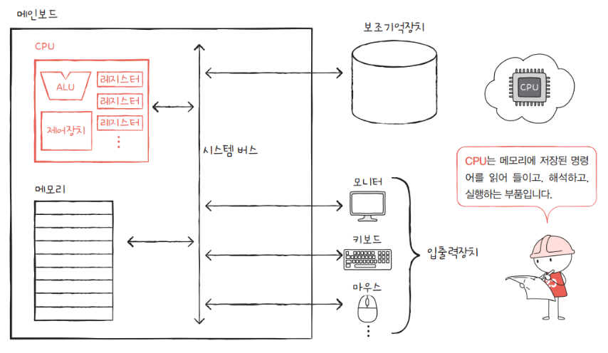 - 메인보드 안에 시스템 버스(양방향 수직 화살표)가 있다.
