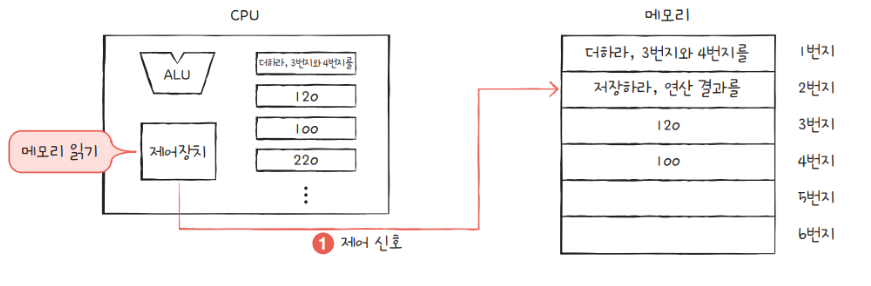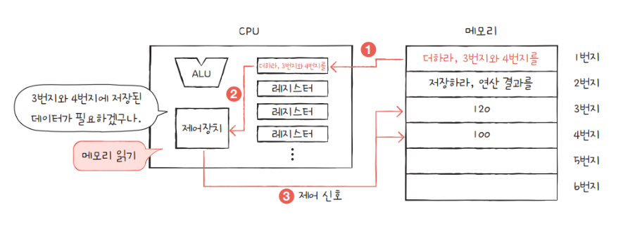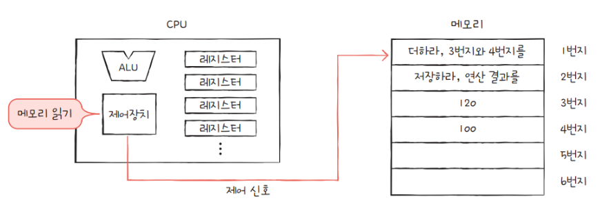 2. 메모리는 1번지에 저장된 명령어를 CPU에 건네주고, 이 명령어는 레지스터에 저장된다. 제어장치는 읽어 들인 명령어를 해석한 뒤 3번지와 4번지에 저장된 데이터가 필요하다고 판단한다. 제어장치는 3번지와 4번지에 저장된 데이터를 읽어 들이기 위해 메모리에 '메모리 읽기' 제어 신호를 보낸다.