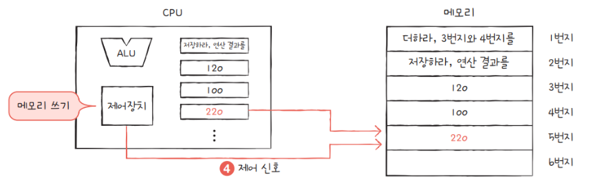 제어장치는 계산 결과를 저장하기 위해 메모리에 '메모리 쓰기'제어 신호와 함께 계산 결과인 220을 보낸다. 메모리가 계산 결과를 저장하면 두 번째 명령어의 실행도 끝난다.