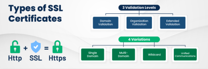 오늘날 사용할 수 있는 SSL 인증서에는 세 가지 유형이 있다. 확장 유효성 인증서(EV SSL), 조직 유효성 인증서(OV) 및 도메인 유효성 인증서(DV SSL). 암호화 수준은 각 인증서에 대해 동일하며, 인증서를 얻는데 필요한 심사 및 확인 프로세스가 다르다.
