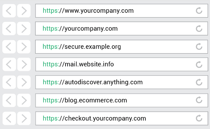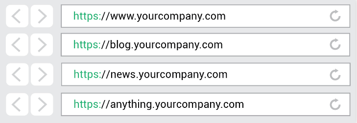 와일드카드 SSL 인증서는 기본 도메인과 기본 도메인 아래의 하위 도메인을 무제한으로 보호하는 데 사용된다. 예를 들어 www.yourwebsite.com, login.yourwebsite.com, mail.yourwebsite.com 등은 모두 하나의 와일드카드 인증서로 보호된다.