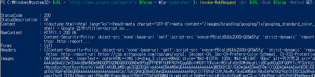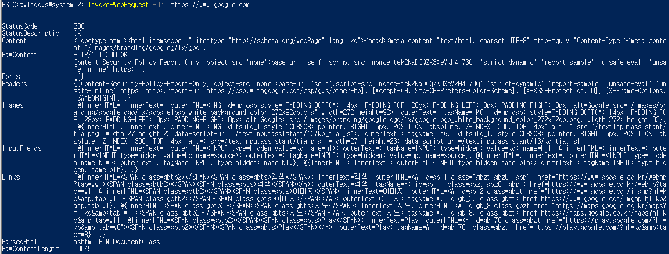 간단하게 Invoke-WebRequest를 이용하여 "구글" 초기화면을 요청해 보도록 하자.