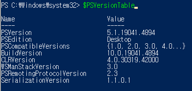 Powershell에서 PSVersionTable을 입력해보면 해당 컴퓨터의 Powershell 버전을 확인할 수 있다.