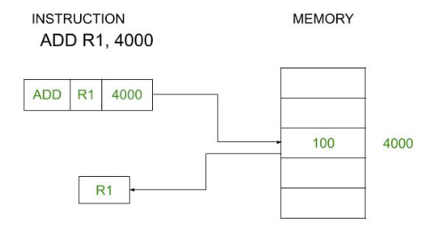 LOAD는 인출과 관련한 연산코드이며, R2는 레지스터, 1000은 메모리 주소를 의미한다. 즉, 메모리 주소 1000에 저장된 데이터를 접근하여 레지스터 R2로 가져오라는 명령이다. 이 방식은 단순하고 이해하기 쉬우며 메모리에 직접 접근하기 때문에 실행 속도가 빠르다. 하지만 메모리 주소를 명령어에 직접 코딩해야 하기 때문에 프로그램을 수정할 때 변경할 게 많다.