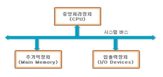 기본적인 컴퓨터 구조 오늘날의 컴퓨터는 대부분 폰노이만 구조를 따른다. 폰노이만 구조는 CPU, 메모리, 입출력장치, 저장장치가 버스로 연결되어 있는 구조를 말한다. 이 구조가 등장하기 이전