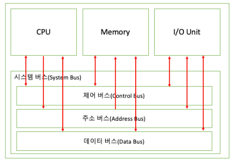 - 제어 버스(control bus) : CPU, 메모리의 입출력 장치 사이 제어 신호(읽기, 쓰기, 버스 요청)와 상태 신호를 전송하는 데 사용