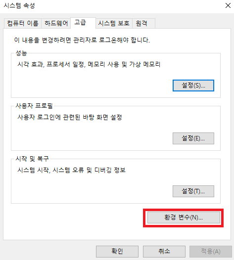 시스템 속성 - 고급 - 환경 변수 클릭 - 새로 만들기