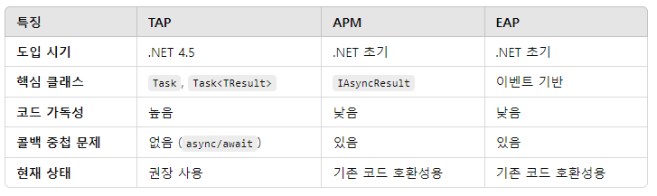TAP(작업 기반 비동기 패턴)에 대해 알아보고 이를 레거시 패턴인 APM(비동기 프로그래밍 모델) 및 EAP(이벤트 기반 비동기 패턴)와 비교합니다.