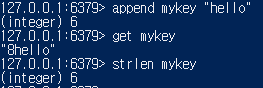 - APPEND key value : 주어진 키에 저장된 문자열 끝에 추가 문자열 value를 붙인다.