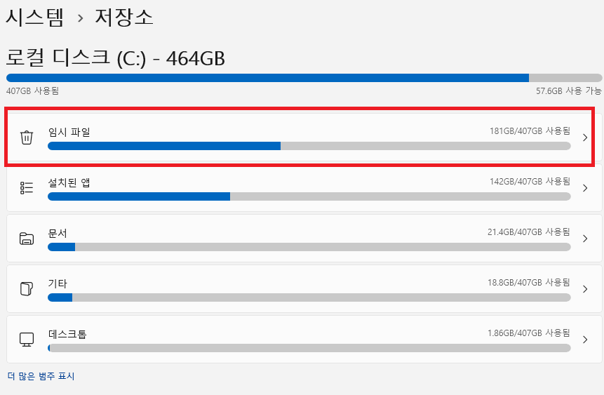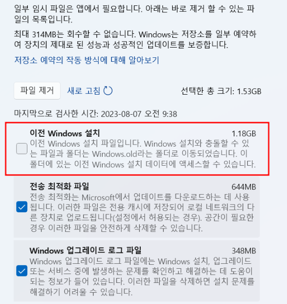 이전 Window 설치 제거 이후에 꽤 넉넉한 공간이 생긴 것을 확인할 수 있다. 해당 탭에 존재하는 다른 항목들도 같이 정리한다면 추가적인 디스크 공간을 확보하는 것이 가능하다. 윈도우11 설치 이후에 쾌적한 PC 사용을 위해서 꼭 정리해 주도록 하자.