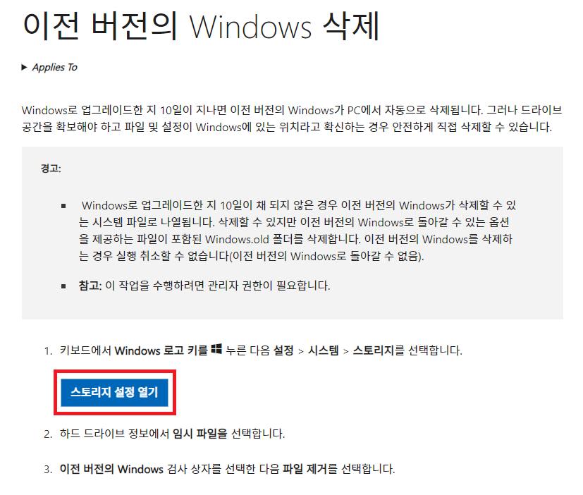 이전 버전의 Windows 삭제 - Microsoft 지원
