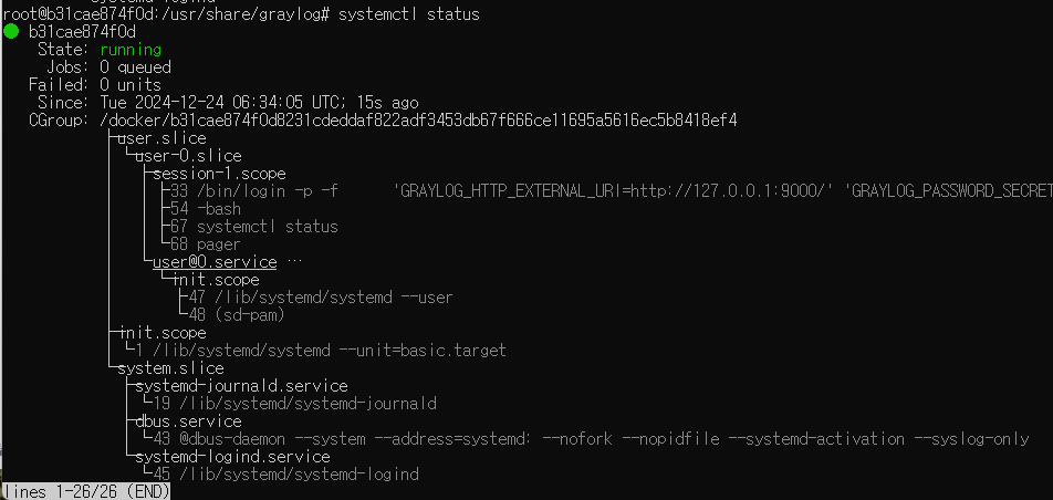 해당 에러 메시지가 뜨면서 systemctl 명령어가 실행되지 않는다. 위에서 설명했다시피 도커 컨테이너는 단일 프로세스로 동작하는 것을 기반으로 설계되었기 때문에 systemctl 명령어가 정상적으로 뜨기 위해서는 추가적인 작업이 필요하다.
