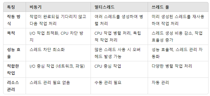 - I/O 작업 최적화 : 비동기 방식은 CPU를 차단하지 않고, 네트워크 요청 또는 파일 읽기/쓰기를 기다리는 동안 다른 작업 수행