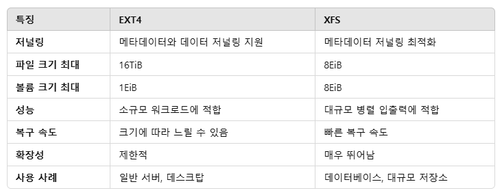 포맷(format)은 저장 장치에 파일 시스템을 설치하는 것을 의미한다. 즉, 저장 장치를 사용하기 전에 파일 시스템을 설치해 파일을 저장할 수 있는 상태로 만드는 것이다. 저장 장치에 파일 시스템을 설치하면 기존 파일 시스템의 정보가 지워지므로 데이터는 모두 삭제된다. 리눅스 시스템의 디스크도 파일 시스템을 설치해야 사용할 수 있다. 리눅스에서 주로 사용하는 디스크 파일 시스템은 EXT4와 XFS이다. EXT4(Extended Filesystem 4)는 PC 환경에서 널리 쓰이는 파일 시스템으로 안정적이고 균형 잡힌 성능을 보여준다. XFS(Extendible File System)는 EXT4보다 대용량 파일에 최적화돼 있어 대용량 데이터 처리나 서버 환경에서 주로 사용된다.