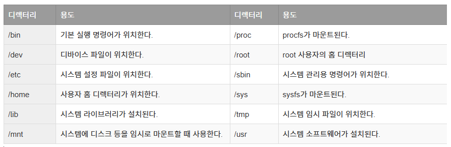 루트 디렉터리(root directory)는 파일 시스템의 최상단에 위치하는 디렉터리로, /로 표기한다. 시스템의 모든 파일과 디렉터리가 루트 디렉터리 하위에 구성된다. 루트 디렉터리의 바로 아래에 생성된 디렉터리는 전통적으로 그 이름과 역할이 정해져 있다. 반드시 지켜야 하는 규칙은 아니지만 전통적으로 그래 왔고, 앞으로도 그럴 것이다. 대표적인 디렉터리를 다음과 같다.