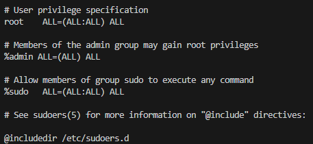 sudo 명령어는 보통 root 사용자의 권한으로 명령을 실행할 때 사용한다. 실행할 때는 su 명령어와 마찬가지로 비밀번호를 입력해야 한다. 이때 입력하는 비밀번호는 root 사용자가 아니라 sudo 명령어를 실행한 사용자의 비밀번호이다.(*중요) sudo 명령어를 실행할 수 있는 사용자에 대한 설정이 있어서 sudo 명령어를 실행할 수 있는 사용자인지만 확인하면 되기 때문이다. (sudo 권한은 /etc/sudoers 파일을 통해서 설정한다.)