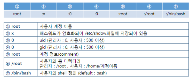 /etc/passwd 파일은 한 사용자에 대한 정보를 한 줄로 표기한다. 각 줄에는 사용자의 여러 정보가 포함돼 있다. 정보는 각각 필드(field)로 나눠 표시하고, 각 필드는 콜론(:) 구분한다. root 계정을 예로 들어 확인해 보자.