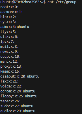 사용자 정보를 /etc/passwd 파일에 저장하는 것처럼 사용자 그룹 정보는 /etc/group 파일에 저장한다. /etc/group 파일을 cat 명령어로 조회하면 시스템에 등록된 사용자 그룹 목록과 정보를 확인할 수 있다.