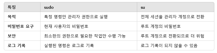 - sudo 명령어를 사용하는 방법은 일반 사용자 권한으로 여러 명령을 실행하다 가끔 root 권한이 필요할 경우에 편리하다.