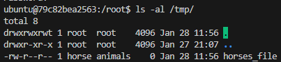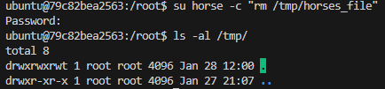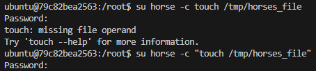 horse 사용자 권한으로 /tmp/horses_file을 생성해 보자. 빈 파일을 생성하는 touch 명령어를 사용한다. -c 옵션 뒤에 오는 빈칸이 포함된 명령을 입력할 때는 이른 하나의 인자로 처리할 수 있게 큰따옴표("")로 묶어야 한다.