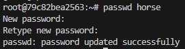 root 사용자로 전환됐으므로 이 셸에서 입력하는 모든 명령은 root 사용자의 권한으로 실행이 된다. horse 사용자의 비밀번호를 변경해 보자. root 사용자의 권한으로 비밀번호를 변경하기 때문에 현재 비밀번호를 물어보지 않고 새로운 비밀번호 설정이 가능하다.