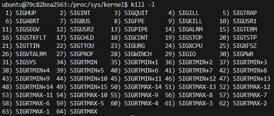 PID 부분에는 종료 명령을 보낼 프로세스의 PID를 입력한다. 옵션은 어떤 시그널을 보낼 것인지 결정한다. 옵션 부분에 시그널 이름이나 시그널 번호를 입력해 전송할 시그널의 종류를 설정할 수 있다. kill 명령어로 전송할 수 있는 시그널의 종류는 -l 옵션으로 확인할 수 있다.