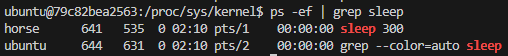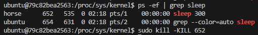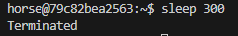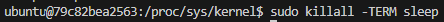 sleep 300을 실행한 터미널에서는 "Terminated"라는 메시지가 나오며 프로세스 실행이 종료되었다. 이번에는 시그널을 입력해서 프로세스를 종료시켜 보자. SIGKILL은 강제 종료를 의미하는, 가장 강력한 종료 시그널이다. SIGKILL 시그널은 옵션에서 -KILL로 표시한다.