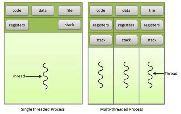 멀티 스레드 프로세스에서 각 스레드는 프로세스 내 다른 스레드와 메모리 공간을 공유하면서 독립된 스택 영역과 실행 컨텍스트(스케줄링 된 스레드가 하던 일을 계속하기 위한 정보 또는 상황)를 유지할 수 있다. 즉, 일부 메모리 영역은 스레드 간에 공유하면서 실행 코드는 스레드별로 실행되는 구조이다. 또한 스레드는 프로세스보다 훨씬 적은 비용으로 생성 및 종료가 가능하다.
